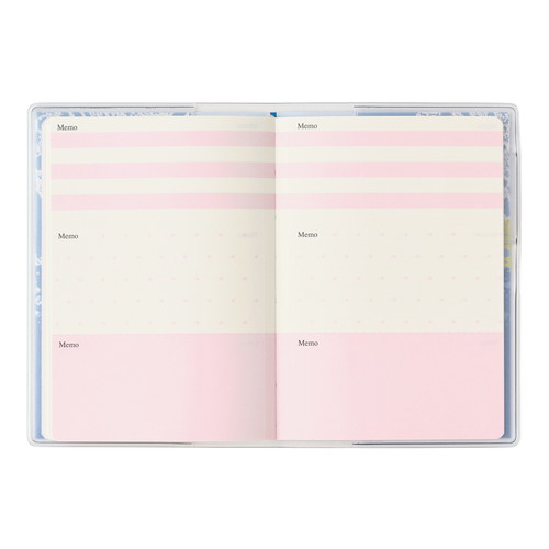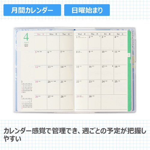 PAGEM by NOLTY(ペイジェム バイノルティ)のマンスリー手帳、リュミエールプチシリーズは3ヵ月ごとに切り替わるカラフルインデックスが特長。 【月間ページ】見開き1ヵ月のベーシックなブロックタイプ(日曜始まり)。カレンダーと同じような感覚で見ることができ、月ごとの予定が把握しやすいのがポイントです。 リバーシブル表紙(裏面は柄のないデザインです) ※表紙を変更しました