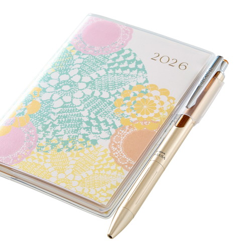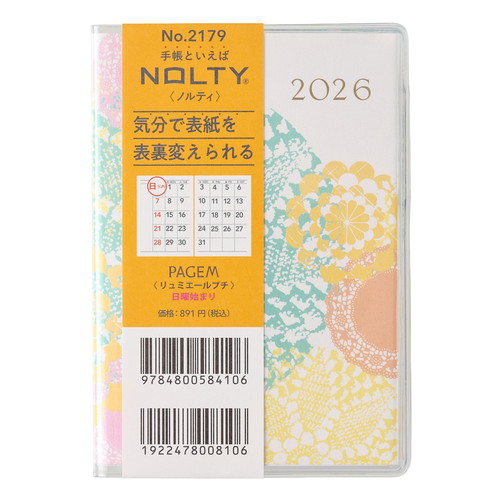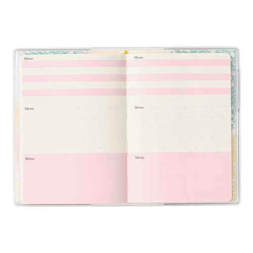 PAGEM by NOLTY(ペイジェム バイノルティ)のマンスリー手帳、リュミエールプチシリーズは3ヵ月ごとに切り替わるカラフルインデックスが特長。 【月間ページ】見開き1ヵ月のベーシックなブロックタイプ(日曜始まり)。カレンダーと同じような感覚で見ることができ、月ごとの予定が把握しやすいのがポイントです。 リバーシブル表紙(裏面は柄のないデザインです) ※表紙を変更しました