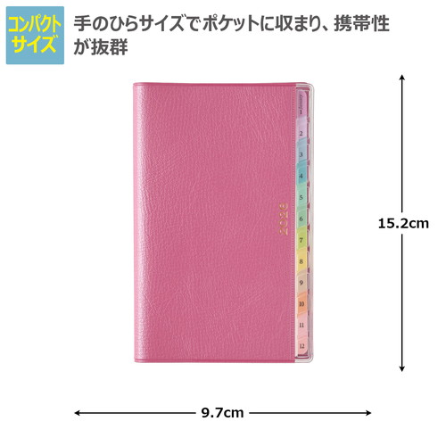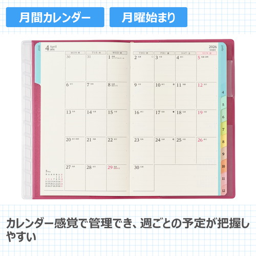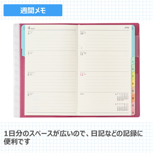 カラフルなインデックスが人気のPAGEM by NOLTY(ペイジェム バイノルティ)のウィークリー手帳シリーズ。 【月間ページ】見たいページがパッと開けるインデックス付き(月曜始まり)。 【週間ページ】見開き1週間で、左右のページに日付が分割されているメモタイプ。1日分のスペースが広いので、日記や食事の記録などに便利です。 ※表紙を変更しました