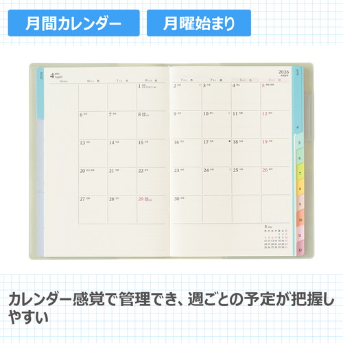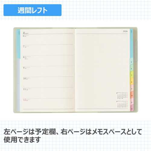 PAGEM by NOLTY(ペイジェム バイノルティ)の仕事でも使える人気ウィークリー手帳。 【月間ページ】見たいページがパッと開けるインデックス付き(月曜始まり)。 【週間ページ】見開き1週間で左に予定、右にメモとして使えるレフトタイプ。予定とメモをバランスよく書きたい人におすすめ。別冊スペシャルリストブック付き。 モデルチェンジ:・週間ページが罫線から方眼に変わりました ・分冊掲載資料が変わりました ※表紙を変更しました