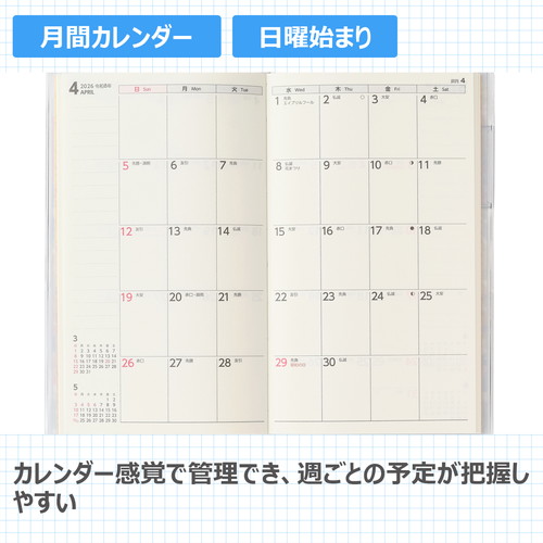 イギリスのブランド、リバティ社の生地を表紙にまとった「PAGEM by NOLTY(ペイジェム バイノルティ) MADE WITH リバティ・ファブリックス」は、使うほどに愛着が増す人気のマンスリー手帳。 【月間ページ】見開き1ヵ月のベーシックなブロックタイプ(日曜始まり)。カレンダーと同じような感覚で見ることができ、月ごとの予定が把握しやすいのが特長です。 ※表紙を変更しました
