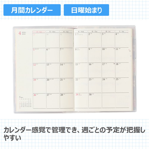 イギリスのブランド、リバティ社の生地を表紙にまとった「PAGEM by NOLTY(ペイジェム バイノルティ) MADE WITH リバティ・ファブリックス」は、使うほどに愛着が増す人気のマンスリー手帳。 【月間ページ】見開き1ヵ月のベーシックなブロックタイプ(日曜始まり)。カレンダーと同じような感覚で見ることができ、月ごとの予定が把握しやすいのが特長です。 ※表紙を変更しました