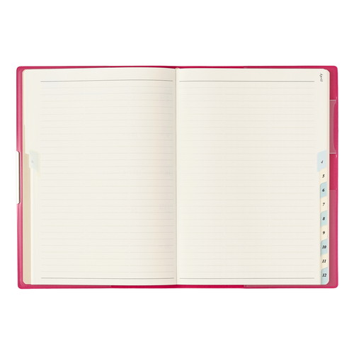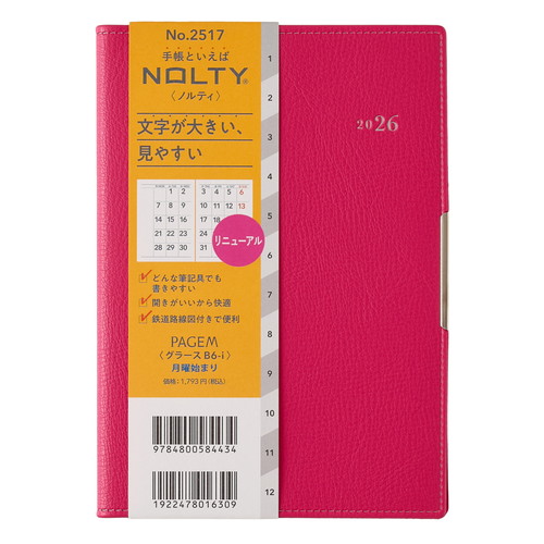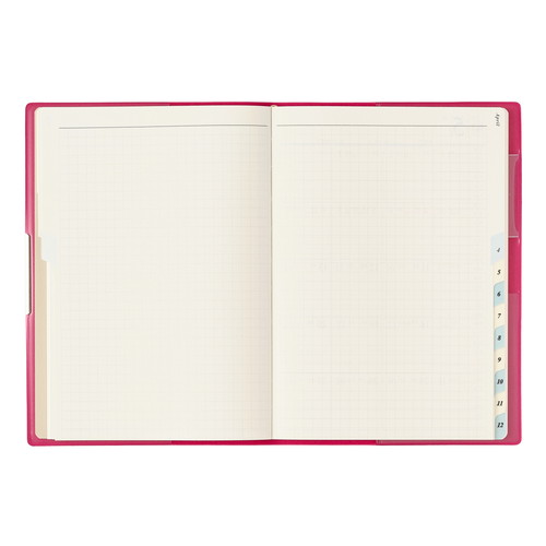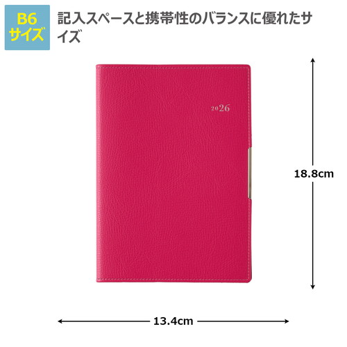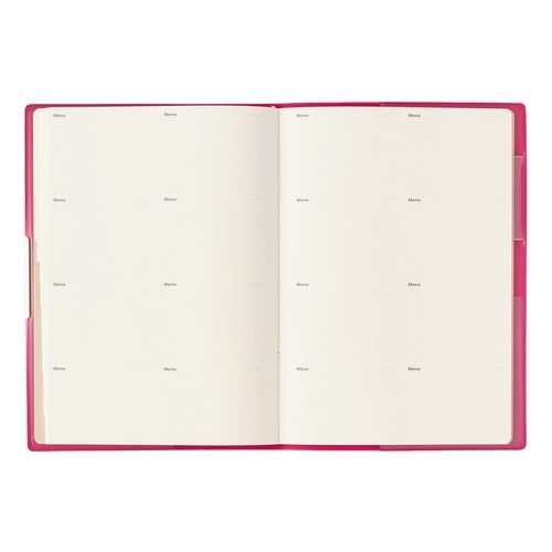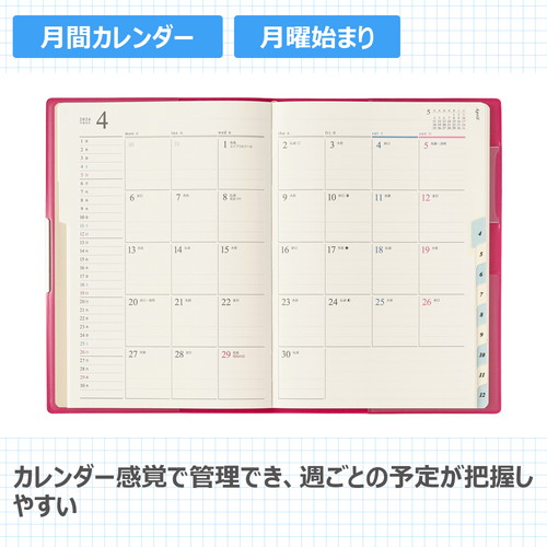 PAGEM by NOLTY(ペイジェム バイノルティ)のマンスリー手帳、グラースB6シリーズは、金具付きでステッチのような箔のデザインが縁に施されているエレガントな表紙が特長です。 【月間ページ】ダブルマンスリータイプが人気の月間ブロックタイプ(月曜始まり)。すっきりとしたデザインのレイアウトで、ストレスなく予定を書き込めます。各月ごとに罫ページが付いているので、その月のできごとをメモするのに便利。 ※表紙を変更しました