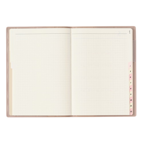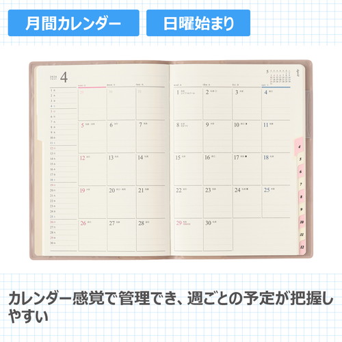 PAGEM by NOLTY(ペイジェム バイノルティ)のマンスリー手帳、B6-iアイダにメモシリーズは、各月のアイダにメモページと方眼ページが2ページずつ付いているのが特長です。 【月間ページ】広々書ける人気のB6サイズ(日曜始まり)。すっきりとしたデザインのレイアウトで、ストレスなく書き込めます。1日のマスを上下に二分割しているので「午前/午後」「自分/家族」など予定を整理して記入できます。 ※表紙を変更しました