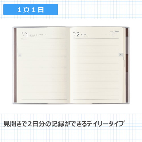 PAGEM by NOLTY(ペイジェム バイノルティ)シリーズの日記帳 【月間ページ】見開き1ヵ月のベーシックなブロックタイプ(日曜始まり)。カレンダーと同じような感覚で見ることができ、月ごとの予定が把握しやすいのが特長です。 【日記欄】見開きで2日分の記録ができるデイリータイプ。予定だけでなく、日記やイラストを書いたり、スクラップブックとして活用するなどさまざまな用途に使えるレイアウトです。