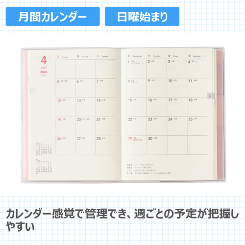 PAGEM by NOLTY(ペイジェム バイノルティ)シリーズの日記帳 【月間ページ】見開き1ヵ月のベーシックなブロックタイプ(日曜始まり)。カレンダーと同じような感覚で見ることができ、月ごとの予定が把握しやすいのが特長です。 【日記欄】見開きで2日分の記録ができるデイリータイプ。予定だけでなく、日記やイラストを書いたり、スクラップブックとして活用するなどさまざまな用途に使えるレイアウトです。 ※表紙を変更しました