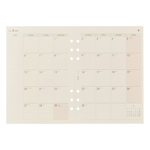 能率手帳の会社がつくるシステム手帳ブランドBindex by NOLTY (バインデックス バイ ノルティ)のリフィル(A5サイズ)。 1ヵ月のスケジュールが一目でわかる、カレンダータイプ。メモ欄付。