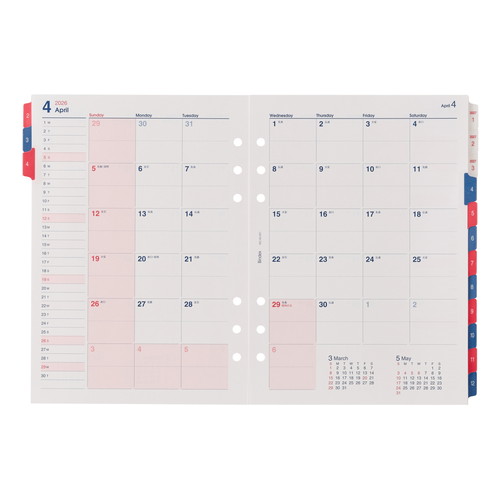 能率手帳の会社がつくるシステム手帳ブランドBindex by NOLTY (バインデックス バイ ノルティ)のリフィル(A5サイズ)。 検索に便利なインデックス付。 壁掛けカレンダーに多い日曜始まり。 ブロック型とタテ型の2つのスケジュール欄。