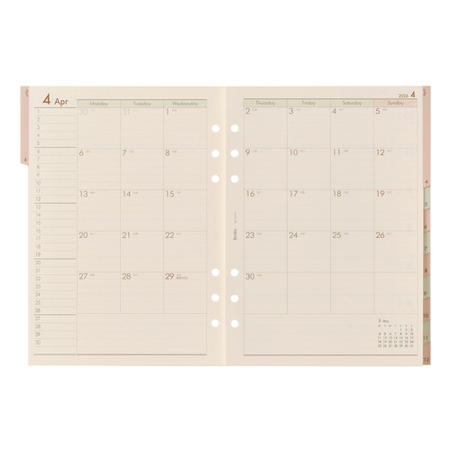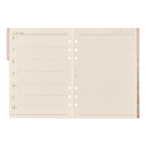 能率手帳の会社がつくるシステム手帳ブランドBindex by NOLTY (バインデックス バイ ノルティ)のリフィル(A5サイズ)。月別インデックス付。インデックス強化シール付。月間と週間を月毎にセット。 ビジネスとプライベートなど複数のスケジュール管理が可能。 ※書きやすいオリジナルクリーム用紙で作ったケイページ(No.A5-401)付。