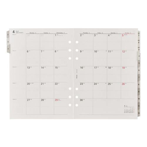 能率手帳の会社がつくるシステム手帳ブランドBindex by NOLTY (バインデックス バイ ノルティ)の新リフィル(A5サイズ)。 日記欄は5週タイプと6週タイプの併用型システム手帳用リフィル