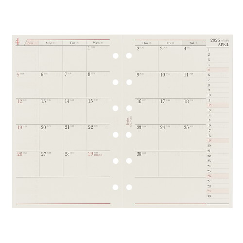 能率手帳の会社がつくるミニ6穴サイズシステム手帳用リフィル。 プライベートとビジネスなどのスケジュールを別々に管理。 壁掛けカレンダーに多い日曜始まり。 Petit PAGEMは2026年版よりBindex by NOLTYへのブランド統合を予定しております。