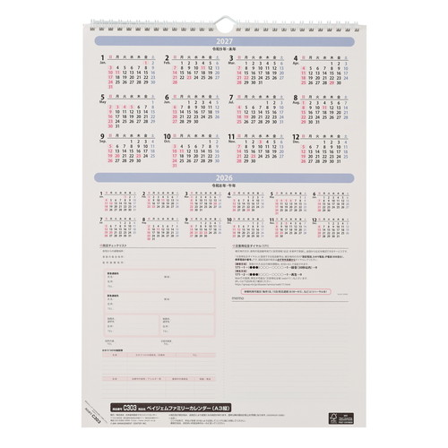 #日本能率協会 ペイジェム ファミリー 2026年 カレンダー 壁掛け A3 C303