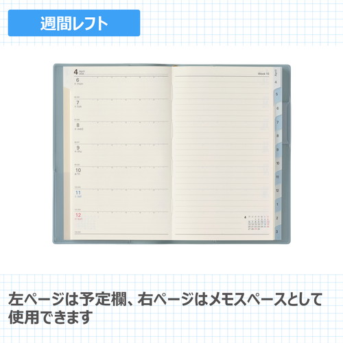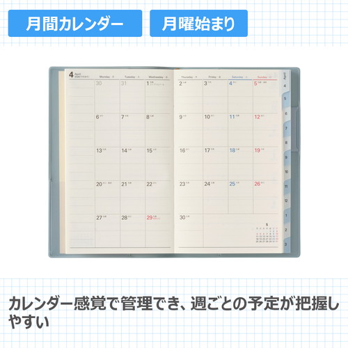 「どんな手帳を買ったらいいかのわからない」というお悩みをお持ちの方にぴったりのシリーズ見たい月をパッと開くことができる便利なインデックス付きです。【月間ページ】見開き1ヶ月のベーシックなブロックタイプ(月曜始まり)。【週間ページ】見開き1週間のレフトタイプ(月曜始まり)。予定とメモにバランスよく使えるので、初心者にもおすすめのレイアウトです。