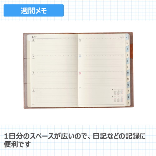 日経WOMAM誌と共同開発した、機能性と高級感を兼ね備えた大人気シリーズ 開きたい月がすぐに見られる便利なインデックス付き。【月間ページ】見開き1ヶ月のベーシックなブロックタイプ(月曜始まり)。【週間ページ】見開き1週間で、左右のページに日付が分割されているメモタイプのレイアウト(月曜始まり)。