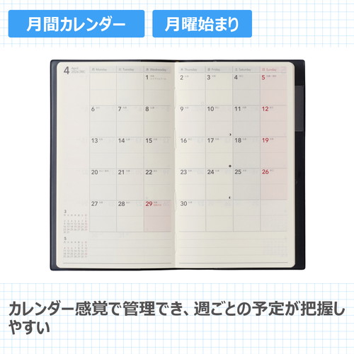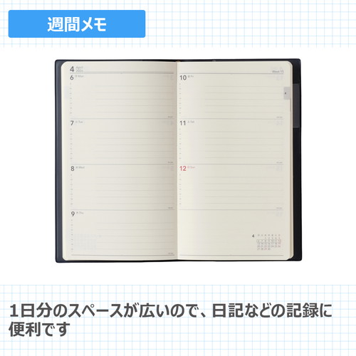 縦長サイズでありながらたっぷりかける横幅が魅力のシリーズレイアウトも豊富なのであなたのライフスタイルに合った一冊がきっと見つかります。【月間ページ】見開き1ヶ月のベーシックなブロックタイプ(月曜始まり)。【週間ページ】見開き1週間のメモタイプのレイアウト(月曜始まり)。1日分のスペースが広いので、日記などの記録にも便利です。