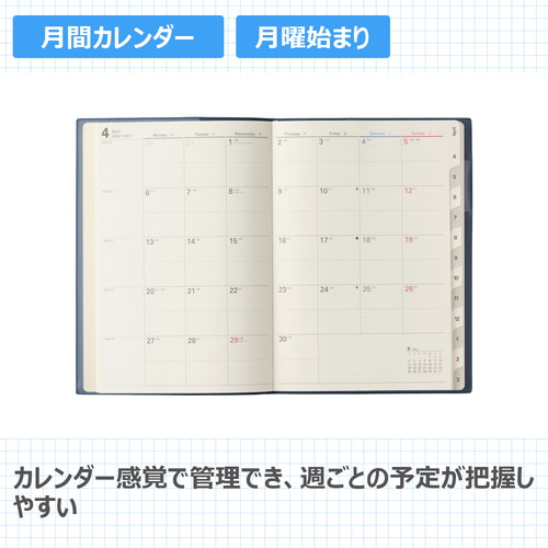 便利なインデックス付きの薄型マンスリー手帳「薄くてもたくさん書ける」ということを追求したカレンダー+メモタイプのダイアリーです。1日の1マスを最大限に大きくし、月と月の間には充実のメモ4ページ。【月間ページ】見開き1ヶ月のベーシックなブロックタイプ(月曜始まり)。見たいページをパッと開けるインデックス付きです。