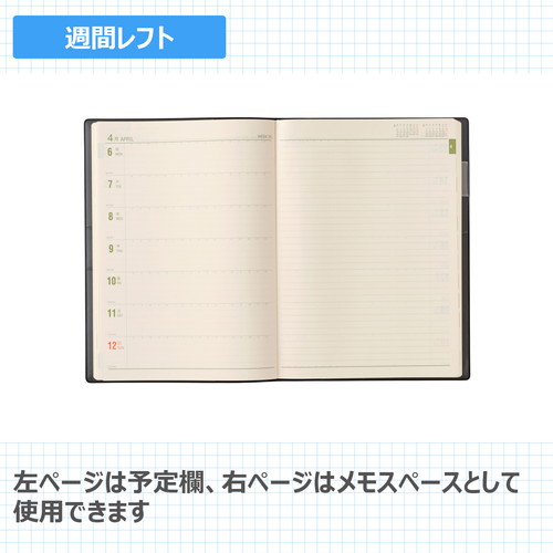 70年以上の歴史を誇る「能率手帳」の大判サイズメモページがノート1冊分以上あり、手帳とノートを一括管理したい人におすすめです。【月間ページ】見開き1ヶ月のベーシックなブロックタイプ(月曜始まり)。【週間ページ】見開き1週間で左ページに予定、右ページはメモスペースとして使えるレフトタイプ(月曜始まり)。