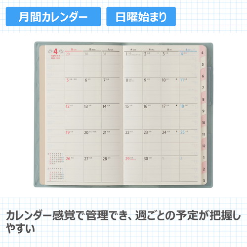 「PAGEMファミリーマンスリー」は、家族の予定を分けて書けるママのための手帳シリーズです。巻末には「防災チェックリスト」などママに役立つ資料がついています。【月間ページ】見開き1ヶ月のベーシックなブロックタイプ(日曜始まり)。カレンダー感覚で1ヶ月の予定が把握でき、見たいページをパッと開けるインデックス付きです。【週間ページ】見開き2週間で日付が縦に並ぶ罫ページタイプのレイアウト。記入スペースが4分割されているので、家族の予定など項目ごとに見やすく整理して記入できるのが特徴です。