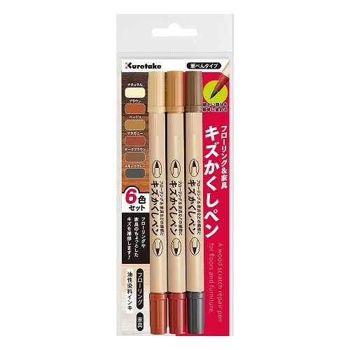 フローリングや家具のちょっとしたキズ・色落ちに最適な補修ペンです。 ・筆ぺんタイプなので、細かい箇所にも塗りやすく、繊細な補修が可能です。 ・6 色のカラーバリエーションがあり、様々な木製品に対応します。※1 本に 2 色【検索ハッシュタグ】#フローリング#家具#木.補修#キズ#呉竹
