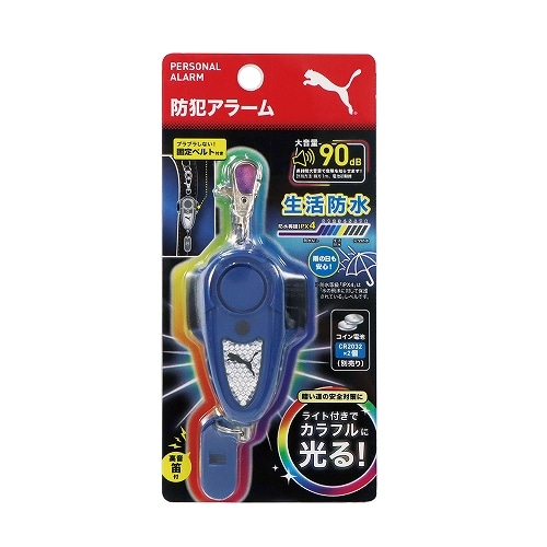 大音量で雨の日も安心な耐水仕様!暗い道でも安全な、カラフルに光るLEDライトが付いた、トリプル機能のPUMA防犯アラーム
