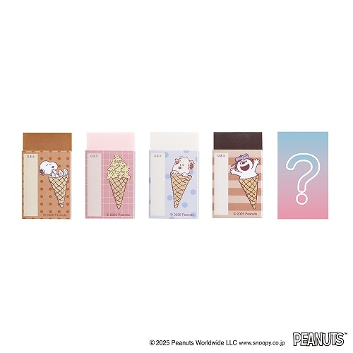 スヌーピーのきょうだいたちが学校帰りにアイスクリームを食べているシーンをイメージした文具シリーズ。わいわいがやがや楽しい雰囲気を表現したデザインです。【検索ハッシュタグ】#ペンケース#スヌーピー#消しゴム#学用品#学童文具#クツワ