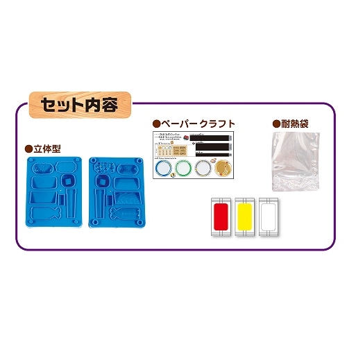 レンジで簡単におすしのけしごむが作れるキットです。リアルできれいな形に作れる立体型付。レモン&コーンスープの香り付。かわいく飾れるペーパークラフトが付いています。