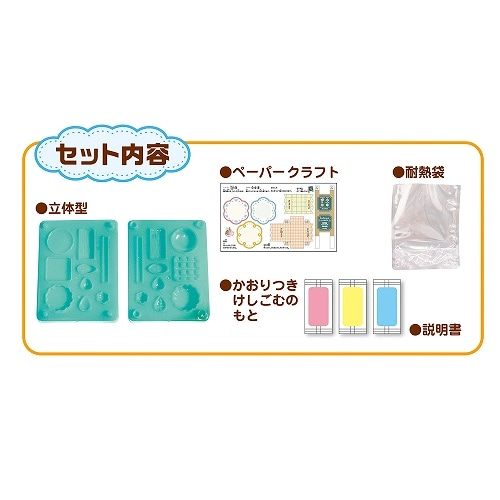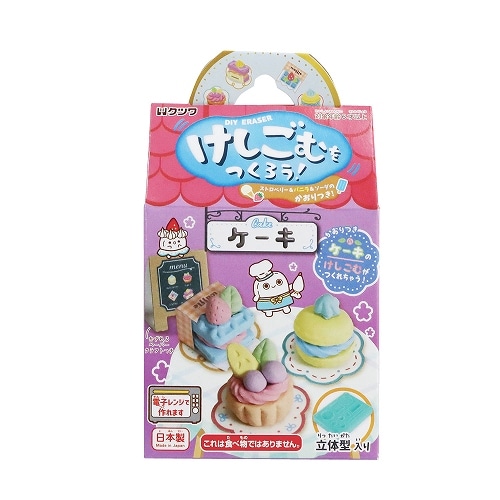 レンジで簡単にケーキのけしごむが作れるキットです。リアルできれいな形に作れる立体型付。ストロベリー&バニラ&ソーダの香り付。かわいく飾れるペーパークラフトが付いています。