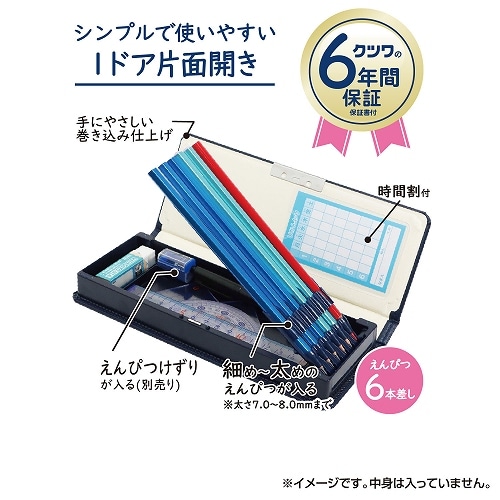 ランドセルにぴったり入る、コンパクトサイズの1ドア筆入です。ランドセルにもよく使われている「クラリーノ」生地を使用しています。6本差しの鉛筆ホルダーにはスリットが入っており、細め?太め(7?8mm)の鉛筆に対応しています。6年間保証書付【検索ハッシュタグ】#筆入#マグネット筆入#筆箱#ペンケース#新入学#学用品#学童文具#クツワ