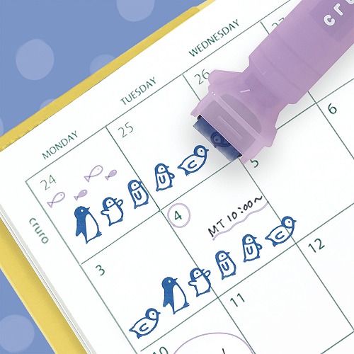 カラーペン一体型のローラースタンプ、連続して押印できる回転式の浸透印(40~50m印字可能)です。コロコロと転がすと可愛い動物がスタンプされます。ペンケースに入れやすいペンタイプ。スタンプに合わせて描き足しを楽しめる、ペン先0.5mmの水性カラーペン。スタンプ柄:よちよちペンギン(スタンプ色:ブルー)/カラーペン色:クリアパープル【検索ハッシュタグ】#スタンプ#ローラースタンプ#水性ペン#デコ#ペンギン#クルロ#クツワ