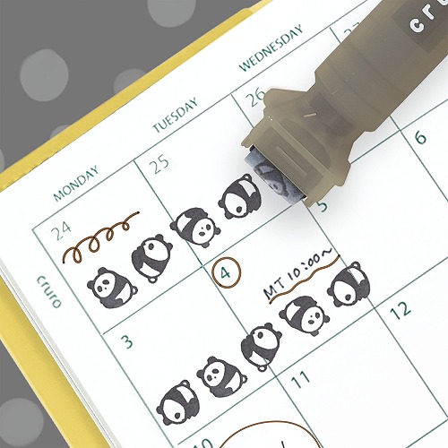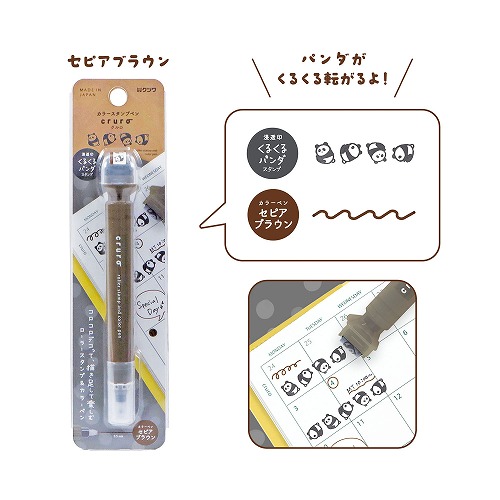 カラーペン一体型のローラースタンプ、連続して押印できる回転式の浸透印(40~50m印字可能)です。コロコロと転がすと可愛い動物がスタンプされます。ペンケースに入れやすいペンタイプ。スタンプに合わせて描き足しを楽しめる、ペン先0.5mmの水性カラーペン。スタンプ柄:くるくるパンダ(スタンプ色:ブラック)/カラーペン色:セピアブラウン【検索ハッシュタグ】#スタンプ#ローラースタンプ#水性ペン#デコ#パンダ#クルロ#クツワ