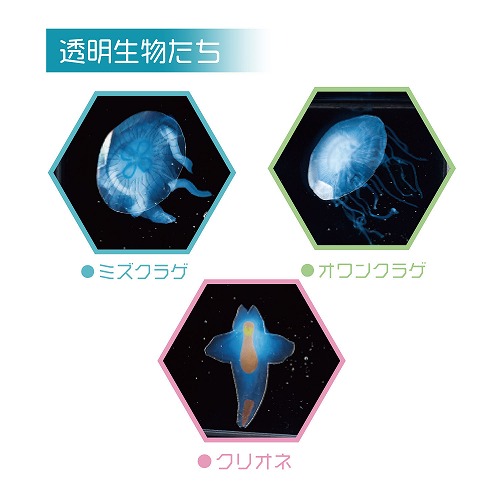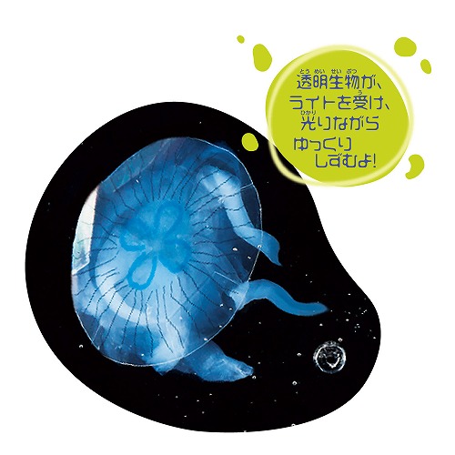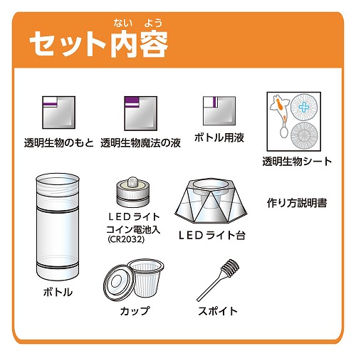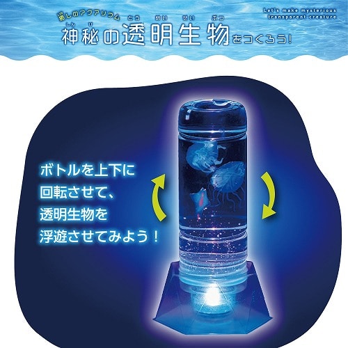 2液の不思議な反応で液が固まり、3種類の透明生物が作れる! 容器を上下に反転させると透明生物がライトを受け光りながらゆっくりとしずむ。暗いところで見るときれいな、7色に変わるLEDライト、台付。【検索ハッシュタグ】#透明生物#工作キット#家遊び#ホビー#クツワ