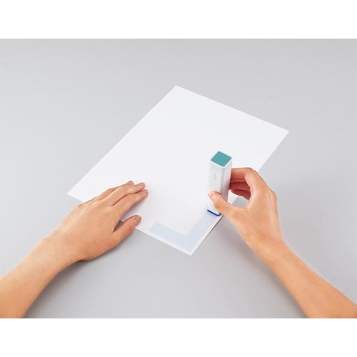 紙のカドまでしっかり塗るために四角い形に作られたスティックのりです。本体も、従来の円筒形ではなく四角形になったことで、デスクから転がって落ちにくく、のりを送り出すツマミも握りやすくなりました。