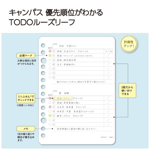 ・隙間時間にサッと勉強できる便利なキャンパスミニルーズリーフシリーズ・TODO管理がしやすいA6サイズのルーズリーフです・左端にある必須マークを使って、大事な項目や優先度が高い項目に目印をつけることで、勉強の計画性を上げられます・TODOリストの下段にあるメモ欄で1日の振り返りや補足が書き込めます・別売の「キャンパス ノートのように使えるバインダーA6サイズ」にセットすることで、持ち運びしやすく見たいときにサッと見ることができます・別売の「キャンパス ルーズリーフのためのふせん」を使うことで、移動中も簡単にマークすることができます
