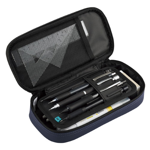 ●オリジナル設計の「波なみホルダー」は、柔軟性のある波型の仕切りが大切なペンを守り、太軸やグリップ付きのペンも抜き差ししやすい。●「波なみホルダー」はお気に入りのペンを隠す部分が少なく、また「波なみホルダー」のベース部分は下段スペースを隠してくれるため、上段のお気に入りのペンをディスプレイしたようにきれいに見せることができる。●収容するアイテムに合わせたさまざまなサイズのポケット。フタ裏には定規などが入るメッシュポケット、ペントレー裏にはシャープ替芯2個とふせんが入る薄型ポケット。下段は消しゴムや修正テープ用の小物スペースと約15本のペンが収容できる大スペースに仕切られているため、整理しやすく取り出しやすい。●丈夫なコーティング生地にクッション材を内蔵し、周囲にパイピングを施した、耐久性と高級感にこだわったデザイン。本体サイドのネームタグと、ホルダーの「ウェブレ」をアイコン化したタグがアクセント。【検索ハッシュタグ】#kokuyo#コクヨ#ペンケース#筆箱#ポーチ#大容量#二階建て##おしゃれ#シンプル#学生#シャープ#シャーペン#シャープペンシル#高級#波なみホルダー