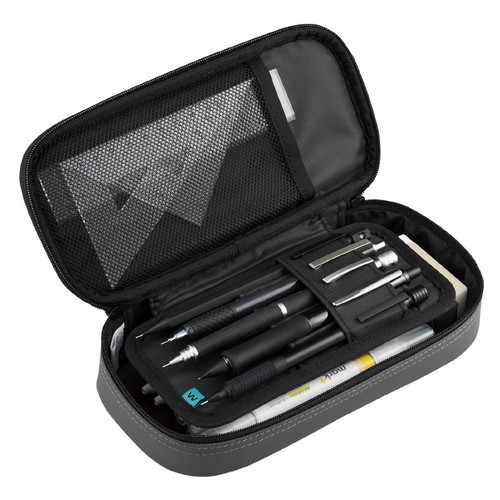 ●オリジナル設計の「波なみホルダー」は、柔軟性のある波型の仕切りが大切なペンを守り、太軸やグリップ付きのペンも抜き差ししやすい。●「波なみホルダー」はお気に入りのペンを隠す部分が少なく、また「波なみホルダー」のベース部分は下段スペースを隠してくれるため、上段のお気に入りのペンをディスプレイしたようにきれいに見せることができる。●収容するアイテムに合わせたさまざまなサイズのポケット。フタ裏には定規などが入るメッシュポケット、ペントレー裏にはシャープ替芯2個とふせんが入る薄型ポケット。下段は消しゴムや修正テープ用の小物スペースと約15本のペンが収容できる大スペースに仕切られているため、整理しやすく取り出しやすい。●丈夫なコーティング生地にクッション材を内蔵し、周囲にパイピングを施した、耐久性と高級感にこだわったデザイン。本体サイドのネームタグと、ホルダーの「ウェブレ」をアイコン化したタグがアクセント。【検索ハッシュタグ】#kokuyo#コクヨ#ペンケース#筆箱#ポーチ#大容量#二階建て##おしゃれ#シンプル#学生#シャープ#シャーペン#シャープペンシル#高級#波なみホルダー
