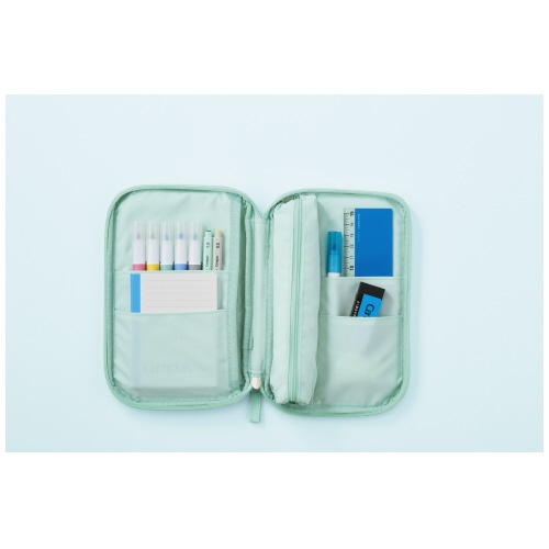 ・ノートのように開くので一覧性が良く、出し入れがしやすい・マルチポケットで文具やメモ帳をキレイに仕分けられる・持ち運びしやすいフラットな形状・A6サイズのノートやバインダーが入るポケット付き