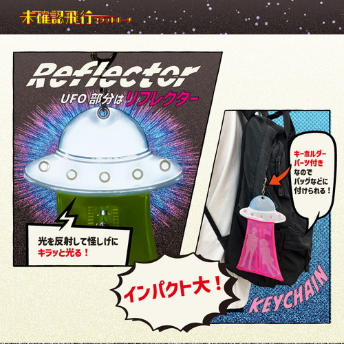 アクリルスタンドやミニフィギュアなど小物が収納できるフラットポーチ。UFO部分はリフレクター。キーホルダーパーツ付きなのでバッグなどに付けることができます。