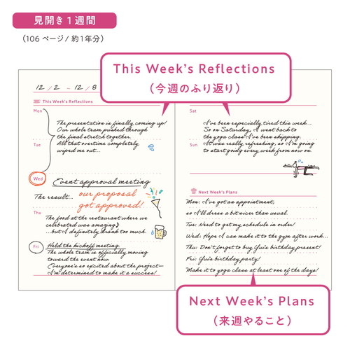 巻頭の『やりたいことリスト』には、すぐに叶いそうな夢、遠い夢・・・小さなことでも大きなことでも書き留めておくことで、日々を前向きに過ごすヒントになります。チェックボックスがついているので叶ったものからチェックをつけていくのもおすすめです。本文は4柄ごとの繰り返しで、毎日書いても飽きのこないデザイン。文庫本サイズなので持ち歩きやすく、省スペースです。【検索ハッシュタグ】#ダイゴー#日記#ログ#記録#習慣