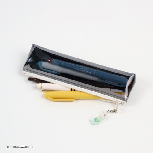 可愛いアクリルチャーム付き。表面はキャラクターのデザインが印刷されています。裏面はクリア素材で中身が見える仕様、スリムながら収納力もある程よいサイズ感です。