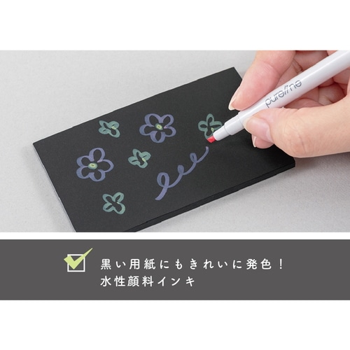 ノート・ダイアリーをきれいにまとめるられる。水性顔料インキを使用しているので、紙の裏抜けや裏うつりがしづらく、黒い用紙に書いたときも、筆跡のにじみが少なく、きれいに発色します。「ロジカル罫」の幅とピッタリ。インク色キャップ先端と同色です。【検索ハッシュタグ】#pureline#ピュアライン#サインペン#マーカー#黒紙に書ける#黒付箋に書ける#noir pad用#ノアールパッド用#裏写りしにくい#カラーペン#ナカバヤシ#Nakabayashi