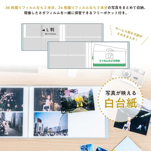 撮影に使用したカメラのボディカラーや、フィルムの仕様にあわせて選べる4色展開。ポケット台紙は、写真が映えるPP製白台紙を採用。撮影日や使用フィルム等のメモができるタイトルカード付き。【検索ハッシュタグ】#ナカバヤシ#写真アルバム#L判#フォトアルバム#72枚用#ブルー系#写真整理#思い出保存#家庭用#大量収納#整理整頓#コレクション#シンプル#保管#閲覧用
