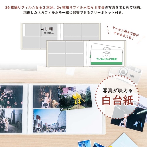 撮影に使用したカメラのボディカラーや、フィルムの仕様にあわせて選べる4色展開。ポケット台紙は、写真が映えるPP製白台紙を採用。撮影日や使用フィルム等のメモができるタイトルカード付き。【検索ハッシュタグ】#ナカバヤシ#写真アルバム#L判#フォトアルバム#72枚用#ホワイト系#写真整理#思い出保存#家庭用#大量収納#整理整頓#コレクション#シンプル#保管#閲覧用