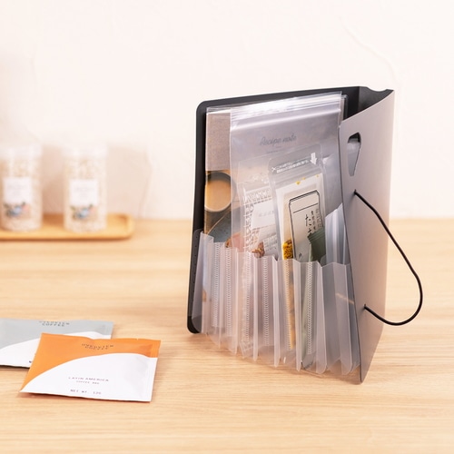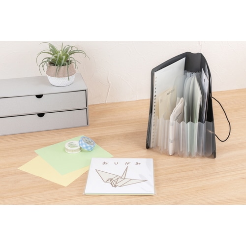 立てて使えるコンパクトサイズのドキュメントファイルです。大きく開くので、使いたいたいものがすぐに見つかります。ななめカットのポケットで高さのあるものの収納も安心です。A5サイズは、郵便物や薬袋、明細書などの散らかりがちな日常アイテムの収納に。6仕切り7ポケットで、1週間区切りでの収納に便利です。持ち運びやフックがけに便利なハンドル付き。ワンタッチで開閉できるゴムバンド固定式を採用しています。