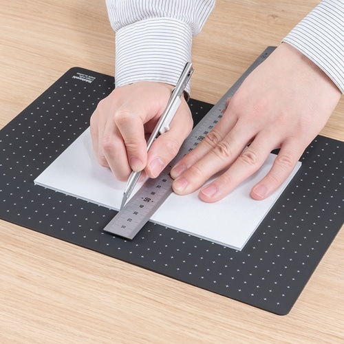 インテリアに馴染むミニマルデザイン。直角がわかりやすい格子罫線と、邪魔にならないドット罫線のいいとこどりの「十字罫線」仕様。 環境に配慮した「オレフィン系樹脂」を使用。持ち運びの際は半分に折りたたんでコンパクトに持ち運ぶことができます。場所やシーンを選ばない落ち着いたカラーの4色展開です。クリアは半透明素材のマットのためライトテーブルなどで透き通り、スクリーントーンや切り絵などのトレース作業に使用できます。【検索ハッシュタグ】#ナカバヤシ#折りたたみカッティングマット#工作用カッティングマット#折り畳みクラフトマット#軽量デスクマット#持ち運び工作マット#コンパクト折りたたみ#クラフト裁断マット#作業机保護マット#両面裁断マット#A4対応#29.7cm×21cm#折りたたみ式デザインマット#模型製作用マット#ペーパークラフト作業用