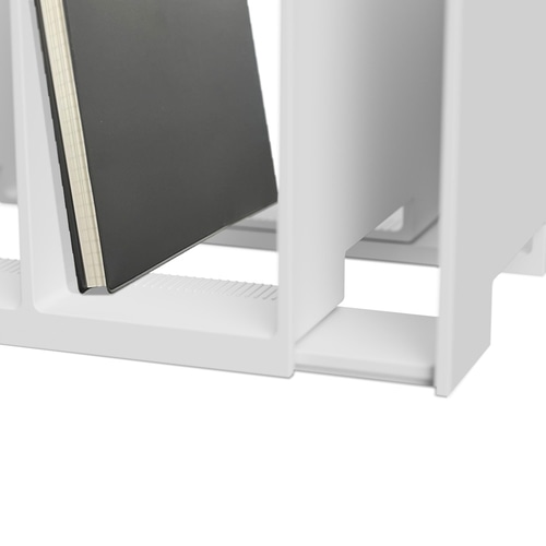 仕切りをスライドさせて、幅が拡がる。収納したいものを増やしたい時、収納物にあわせてワイドに拡がります。収納部の滑り止めでしっかりスタンド。最大約14cmひろがる。【検索ハッシュタグ】#ナカバヤシ#Nakabayashi#ブックスタンド#スライド調整式#幅可変#卓上収納#書類整理#ファイル立て#教科書整理#デスク整理#省スペース#自立式#軽量設計#シンプル形状