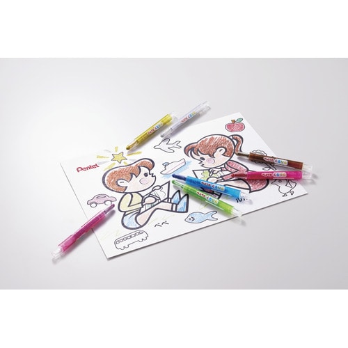 くれよんタッチで描けるくりだし色鉛筆。濃く、鮮やかで、なめらかな書き味。くりだし式なので、手を汚しにくく折れにくくなっています。
