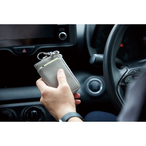 全ての鍵をひとまとめに収納できる合皮製キーケースです。カードや鍵等をホールドできるゴムバンドに加えて外ポケットもあり、スマートキーと一緒に家の鍵やカードキーなども収納できます。