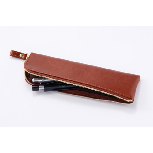 高級感のある合皮製のフラットペンケースです。薄型なのでスペースを取らず、シンプルでコンパクトなのに高級感のある使いやすいデザインです。筆記具3本と消しゴムが収納できます。