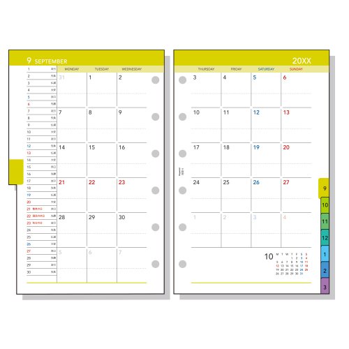 やや厚みのあるしっかりした紙を使用 ・見開き両面1ケ月ブロック式・月曜始まり/カラーインデックス付 期間:2025年12月~2027年3月