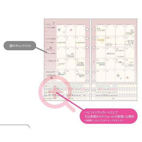 軽くて薄く裏移りしづらい専用紙トモエリバーを使用。deconaシリーズのリフィルです。習慣にしたいことをチェックするリストも搭載。見開き両面1ケ月ブロック式・月曜始まり+横軸マンスリー